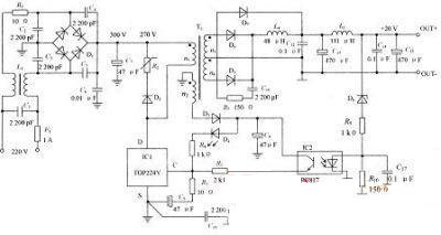 該開關(guān)電源的規(guī)劃方針是安穩(wěn)20 V輸出,輸出電流0~2 A可變,用于音響系統(tǒng)。為了突出降低電磁噪聲的處理技能,簡化電路,用單片開關(guān)電源芯片TOP224Y進(jìn)行規(guī)劃。TOP224Y內(nèi)部已包含了PWM調(diào)制所需的所有電路以及鼓勵(lì)管輸出,由它鼓勵(lì)變壓器,開關(guān)頻率為100 kHz,內(nèi)部MOS鼓勵(lì)管的耐壓為700 V,輸出功率小于45 W。電路如圖1所示,該電路能夠獲得更大的輸出功率,只需更改部分器件。圖1中左邊的電路R1,L1,D1,C1至C7是慣例的共模濾波和整流電路,獲取約300 V的直流電壓供DC-DC改換電路運(yùn)用;最右邊電路L5,C11等是一般的LC濾波電路;IC2,D8,R9,R10組成電壓反應(yīng)電路,構(gòu)成閉環(huán)結(jié)構(gòu),安穩(wěn)電源輸出電壓;中間部分是DC-DC改換器,降噪聲的關(guān)鍵是對(duì)這一部分的電路進(jìn)行適當(dāng)處理。