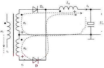 DC-DC改換后的整流管運(yùn)用了三只:D5,D6和D7,沒有獨(dú)立設(shè)置續(xù)流二極管,不同于其他電源電路。D5為續(xù)流而設(shè)置的復(fù)用二極管,D6和是正鼓勵(lì)脈沖整流二極管,D7是反鼓勵(lì)電壓整流二極管。L4是DC-DC改換后的第一級(jí)濾波電感。在正鼓勵(lì)期間,變壓器輸出繞組n3經(jīng)D6,L4輸出電流,第一級(jí)濾波電感L4中電流i4增大,同時(shí),變壓器自身利益的鼓勵(lì)磁電流i1也在增大。